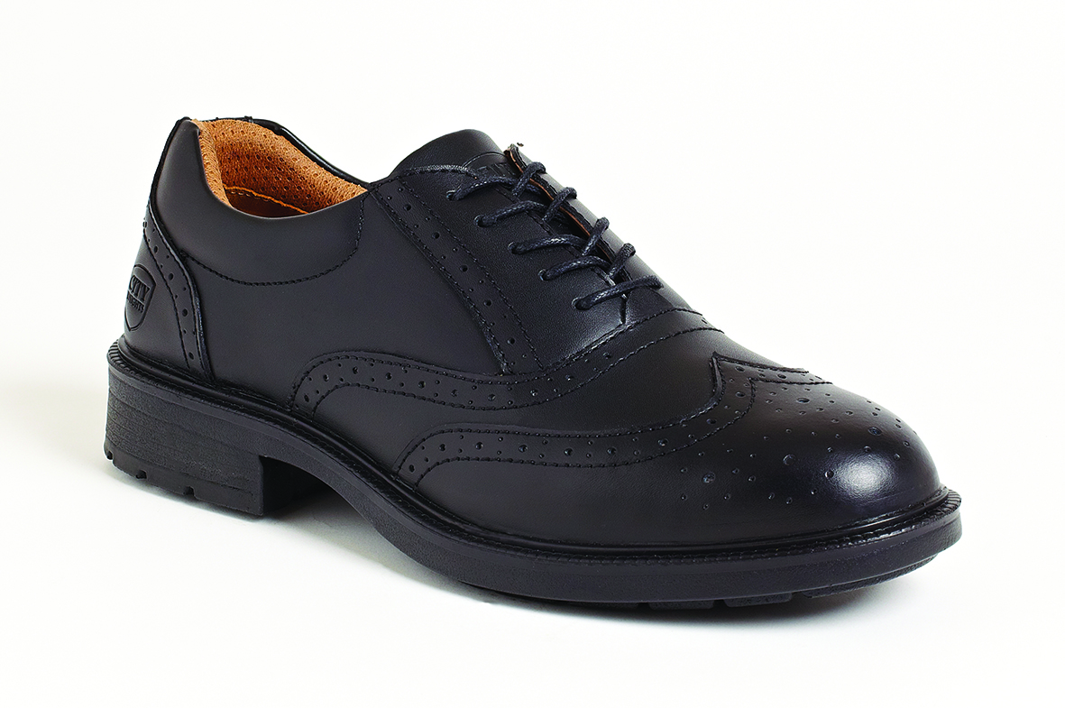Black Leather Brogue Shoe. Features: Steel Toe Cap, Padded Collar, PU Dual Density Sole, Chemical and Oil Resistant Sole, Shock Absorption and Anti Static.