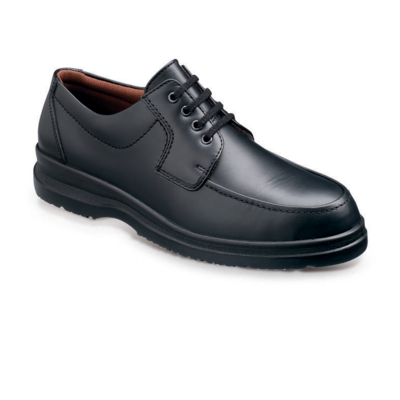 Black Leather Executive Safety Tie Shoe. Features: Steel Toe Cap, Composite Mid-Sole, Padded Collar, PU Dual Density Sole, Chemical and Oil Resistant Sole, Shock Absorption and Anti Static.